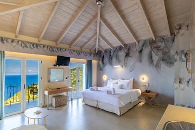 This room type is on the 1st floor and has a balcony which overlooks Petani Bay, the Ionian Sea and the incredible sunsets. They are characterized as one of the best suites available in Kefalonia as it has an open wooded ceiling. Free Wi-Fi is available.